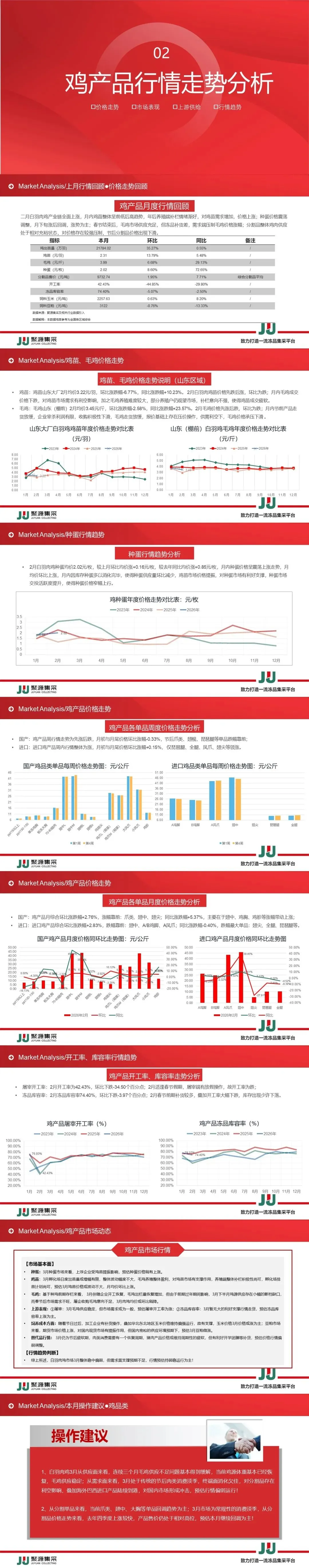 - 鸭产品2月产业链全线上涨,鸭苗排苗顺畅,价格上行,毛鸭供应稳定,分割品价格走势两极分化,“节前稳步拉涨,节后持续下跌”的运行态势;