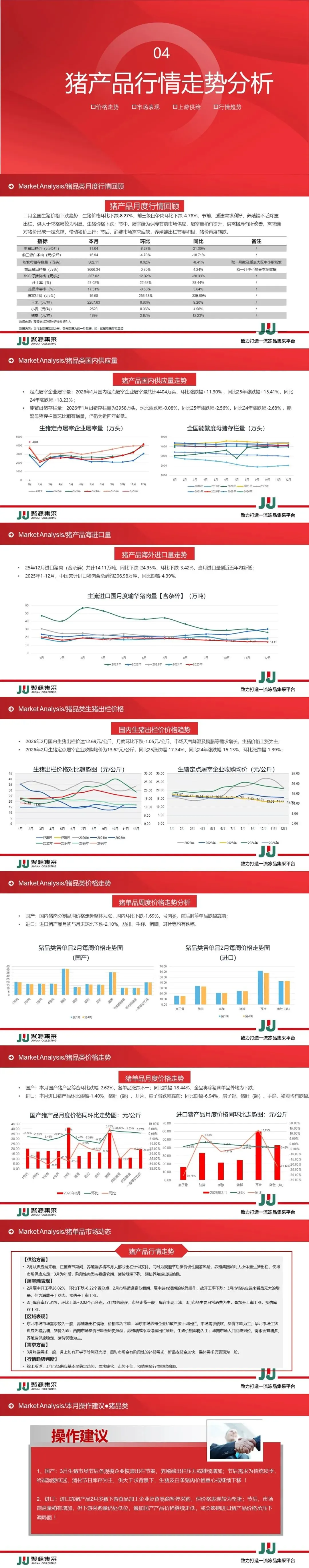 - 猪产品3月因前期节假日影响,部分出栏目标未达目标,故养殖端或继续加大出栏计划,供应压力仍存,需求面较为平淡,预估行情继续偏弱。声明:本文档旨在为聚源集采为同行提供采购行情相关分析参考,文档中涉及的相关产品价格信息及数据分析均来自于市场公开数据和订阅数据录取、整理、编辑所得,因原材料价格随着市场行情波动,价格与本文档存在差异和信息不一致情况,所以本文档内容仅供于参考,不作为投资、买卖、运营决策的唯一参考因素,请谨慎参考使用,如出现任何投资和行情采销失误等行为,本司均不负任何责任。