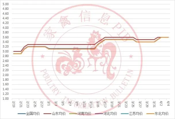 2026年2月19日-2026年4月4日主流地区白羽鸡鸡苗均价走势图