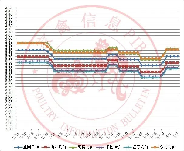 2026年2月18日-2026年4月3日主流地区白羽鸡毛鸡均价走势图