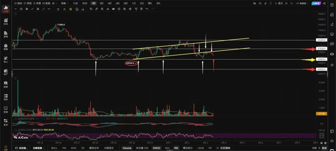 不得不说大饼65500的支撑指定是挺硬,看下方白色箭头所指向下测试了这么多次都没有被跌破,并且每次回踩65500都会出现一波反弹。昨天又来测试了65500同样也出现了反弹,但是这次反弹并没有突破上方67638的阻力只是假突破了旗形下边界连旗形都没有收回去就再次走回调,当下又准备回踩65500的支撑这次回踩65500的支撑反弹不能突破上方白色箭头所指的这个高点67405创出新的高点,在测试65500这个支撑大概率就会被跌破,因为65500的支撑已经撑了很多次,前几次测试65500反弹的力度都还可以每次都能出现更高的高点,后面这两次测试反弹一次不如一次高所以我说再来测试这个支撑反弹不能出现高点就会被跌破,65500一旦被跌破64930必然会给到,就看给到64930附近会不会止跌走盘整,直接顺破那就去63832等止跌信号吧!