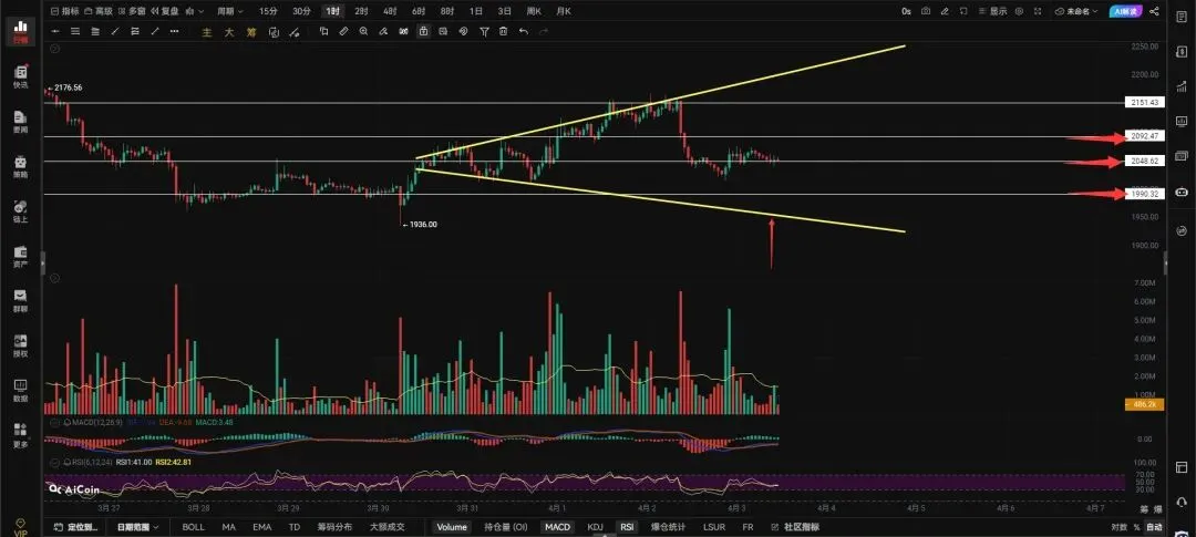 4小时级别跌破2018向下看1980-1937。二饼正在喇叭形态内部走盘整打响了2048的保卫战,站稳2048就会去挑战2092下跌也会结束,在2048下方运行去测试1990的概率很大,只要跌破2000不但回去测试1990还会去测试喇叭形态下边界,就这玩意散会。