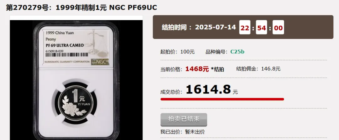 价格怎么落到手上,离不开市场的那口气,成交纪录有人盯过,在2025年7月现代钱币月拍里见到同款,成交总价做到了1614.8元,这个数字可以记但不必死认,每一次上手的状态不同,光泽的连贯度,镜面的洁净度,边齿的完整,评级标签的品相记录,都会对数字有点影响,市场涨落也有自己的节奏,拿它当对照就够了,真正把人留在这枚币上的,多半是它背后的时间指向和纪念意义。【藏品总结】