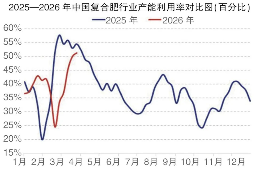 成本端,3月,国内硫磺现货市场呈现单边强势上涨行情。截至3月27日,镇江港硫磺现货成交价报5850元,较2月底上涨1750元,涨幅达43.68%。截至3月末,港口硫磺价格涨势未止。3月30日,镇江港硫磺价格已冲高至6100元,此价较3月初涨幅超过48%。按理论成本测算,硫磺月内上涨1750元,折合磷酸一铵成本上行约788元。硫酸方面,湖北地区送到价月内上涨290元,折合磷酸一铵成本增加约435元。对比来看,磷酸一铵月内涨幅仅200元,生产企业现阶段利润空间被进一步大幅压缩,成本端压力持续加剧。当前,国内磷酸一铵企业整体开工维持偏高水平。截至3月26日,行业产能利用率为69.57%,环比微降0.79个百分点,同比提升9.09个百分点。头部企业为保供高负荷运行,春节前停产检修装置也在3月陆续重启,全月市场供应较为充足,但因成本倒挂,中小型工厂检修、停产增多,磷酸一铵供应将逐步缩减。需求端,下游复合肥企业在3月以春季肥生产为主,对磷酸一铵按需采购,虽然行业开工持续回升,但受原料高价制约,多维持刚需补库,并未出现集中备货行为,整体成交节奏偏缓。