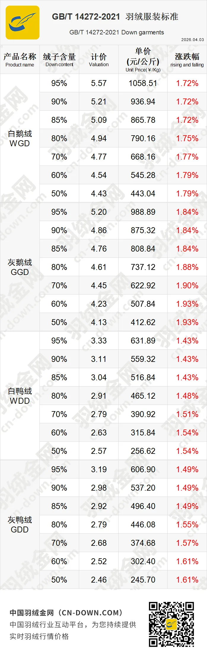【金网发布】2026年4月3日羽绒价格行情 Price of Down on April 3rd, 2026