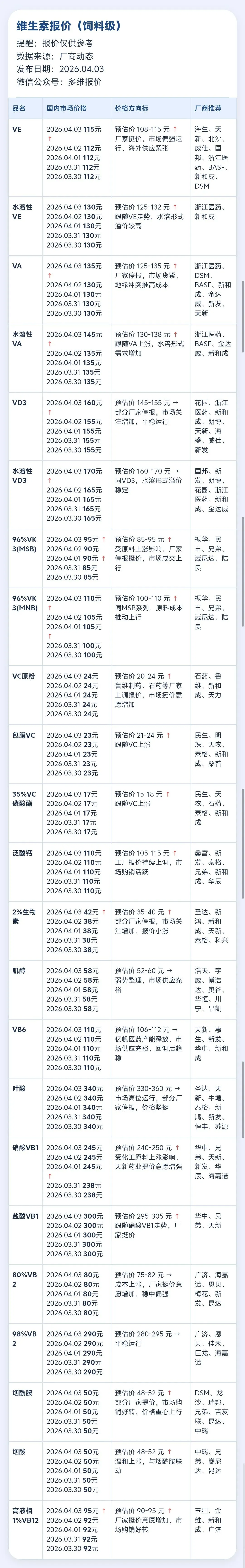 饲料级维生素最新行情报价,VE/VA/VD3全品类提价,VK3、生物素、VB12大幅上涨,VC、泛酸钙等维持高位,市场涨势延续.