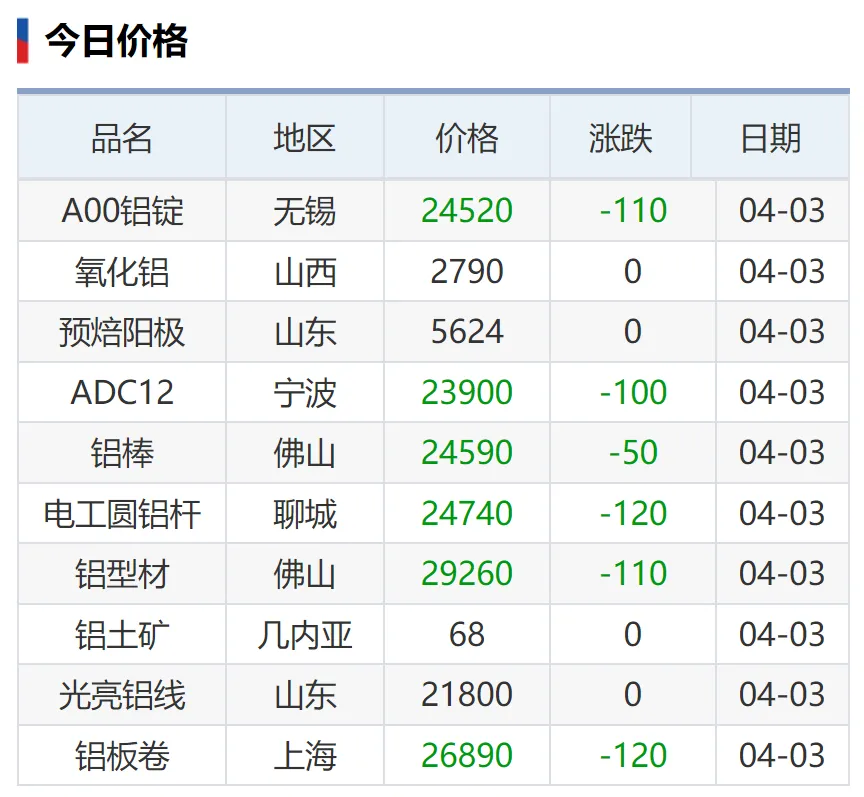 下跌 ! 今日铝价行情!铝锭价格(2026.4.3)