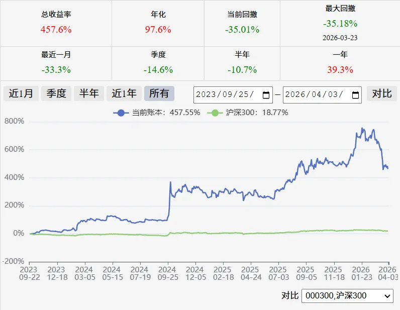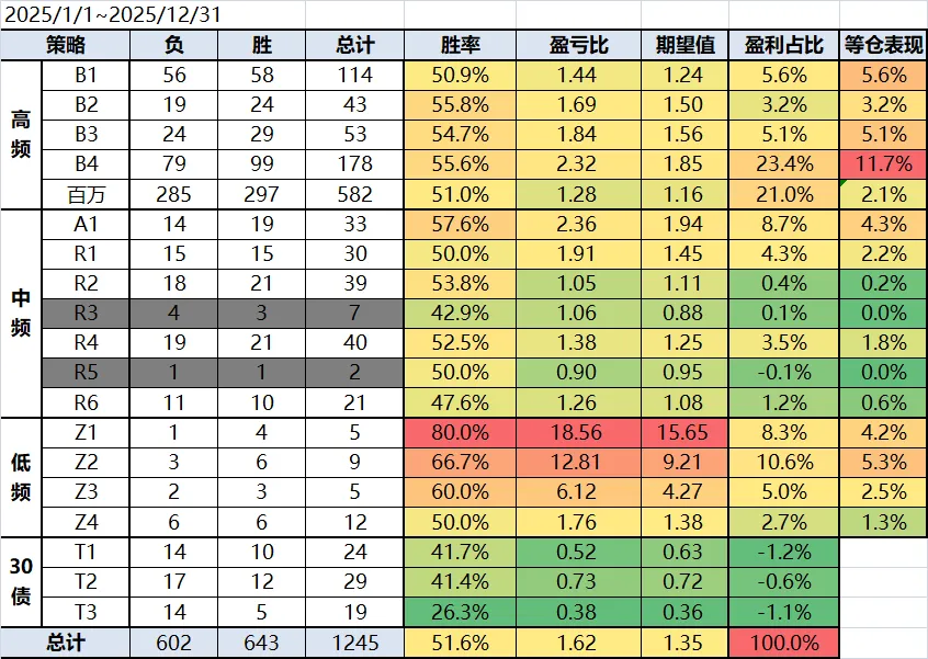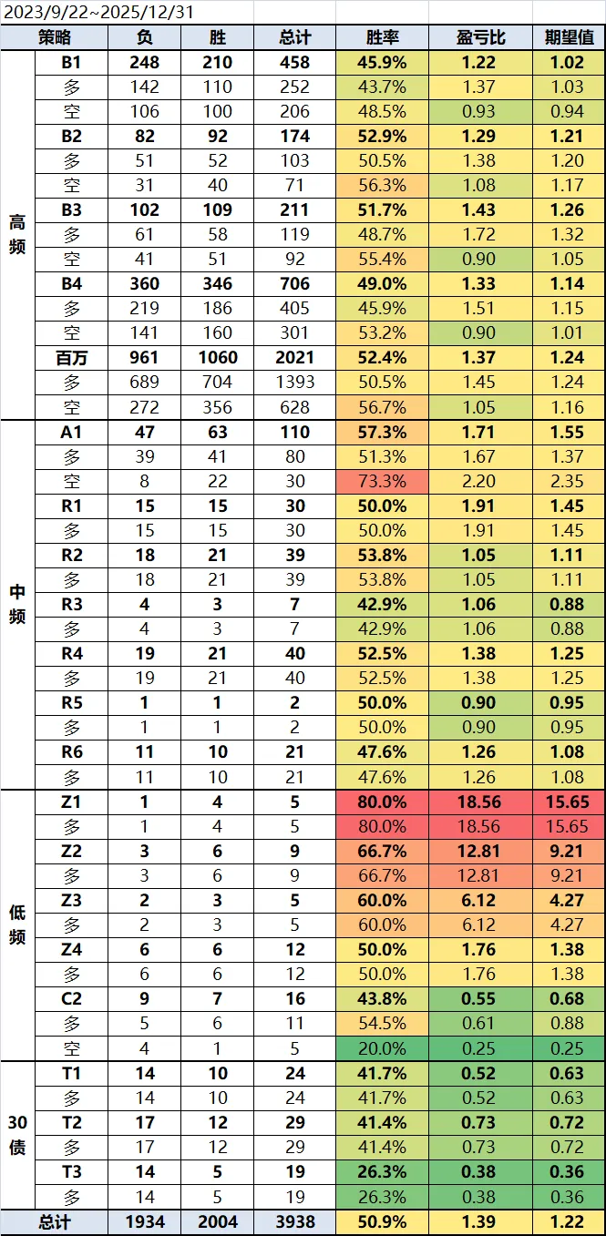 【投资思路】使用各种宽基现货ETF的动量策略的进出场信号,通过信号用四大股指期货做实盘交易【使用的策略】5个分钟级高频(10个百万2023/10开始至25年8月已停、5个B系列2023/9开始)6个日线中频(A1 2023/11开始、R1/RC18号1000单吊中午版2025/1开始、R1/RC2号1000单吊中午版2025/1开始至2026/1已停、R3/RC2号1000单吊中午版2025/1至2025/2已停、R4/RC4号1000单吊30分版2025/5开始、R5/RC5号2000单吊30分版2025/2开始至2026/1已停、R6/RC6号2000单吊30分版2025/2开始至2026/1已停) 4个日线低频(C2 2023/11至2024/11已停、、Z1/专注27号50分版2025/5开始、Z2/愚人节2号50分版2025/5开始、Z3/愚人节3号50分版2025/5开始、Z4/深林21号50分版2025/9开始)3个国债(T1/RC7号中午版2025/4开始、T2/RC7号30分版2025/5开始、T3/RC7号50分版2025/9开始)【投资目标】3~4倍杠杆 预期年化80% 最大回撤50%2023年9月开始实盘数据统计如下(每季度,有时每月结束汇总一次)