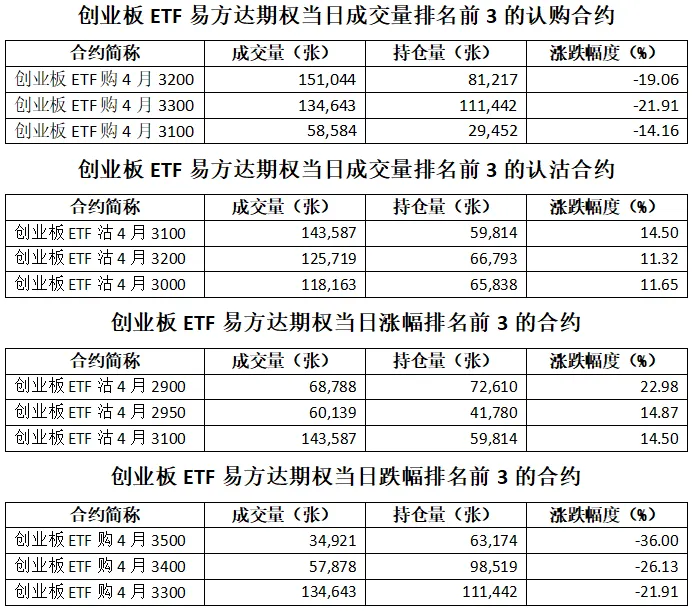 创业板ETF易方达期权总成交面额393.24亿元,减少9.26%,期现成交比为0.24,权利金成交额8.27亿元;期权总成交量1,231,985张,减少9.12%,其中认购期权成交量580,437张,认沽期权成交量651,548张,认沽认购成交比率为1.12(上一交易日认沽认购成交比率为1.16)。
