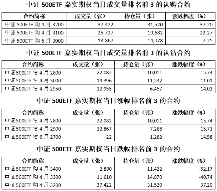 中证500ETF嘉实期权总成交面额75.43亿元,增加4.08%,期现成交比为0.03,权利金成交额1.19亿元;期权总成交量241,833张,增加2.52%,其中认购期权成交量129,823张,认沽期权成交量112,010张,认沽认购成交比率为0.86(上一交易日认沽认购成交比率为1.29)。