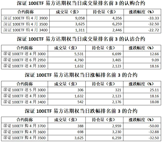 深证100ETF易方达期权总成交面额10.52亿元,减少9.64%,期现成交比为0.01,权利金成交额0.08亿元;期权总成交量30,743张,减少12.31%,其中认购期权成交量16,580张,认沽期权成交量14,163张,认沽认购成交比率为0.85(上一交易日认沽认购成交比率为1.68)。