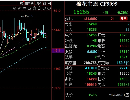 2026年4月3日,郑棉主力合约收于15255元/吨,跌45元/吨。