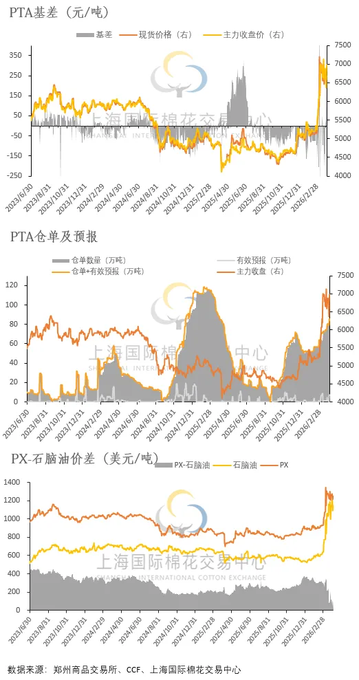 4.上午PTA期货震荡偏强,现货市场商谈氛围一般,现货基差走强。下周主港在05平水附近商谈,价格商谈区间在6715~6915。下周仓单报盘在05+10。据悉早盘下周在05平水有成交。