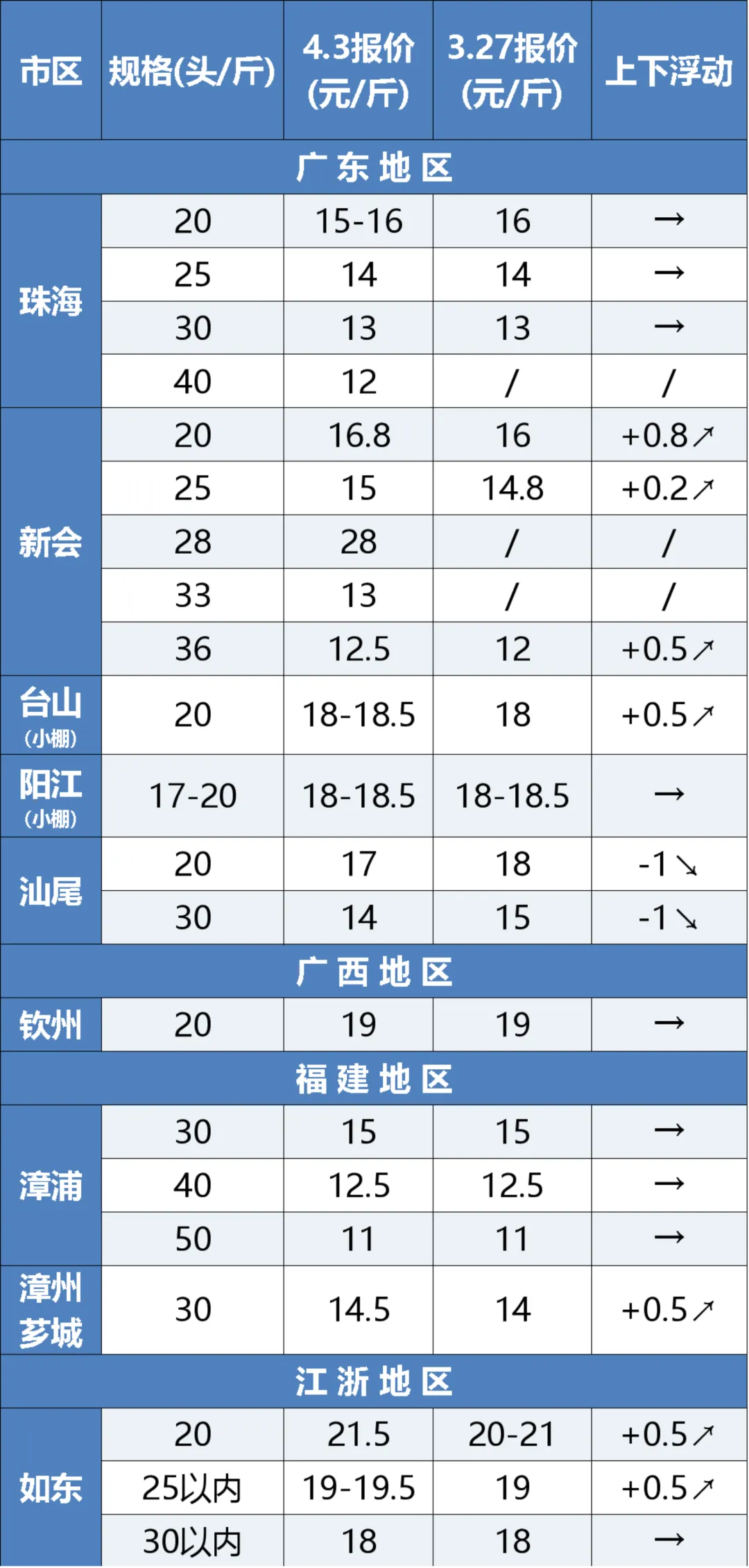 以下是广东、广西、福建等地南美白对虾、斑节虾、罗氏沼虾报价(4月3日)以及一周行情走势分析,供大家参考。