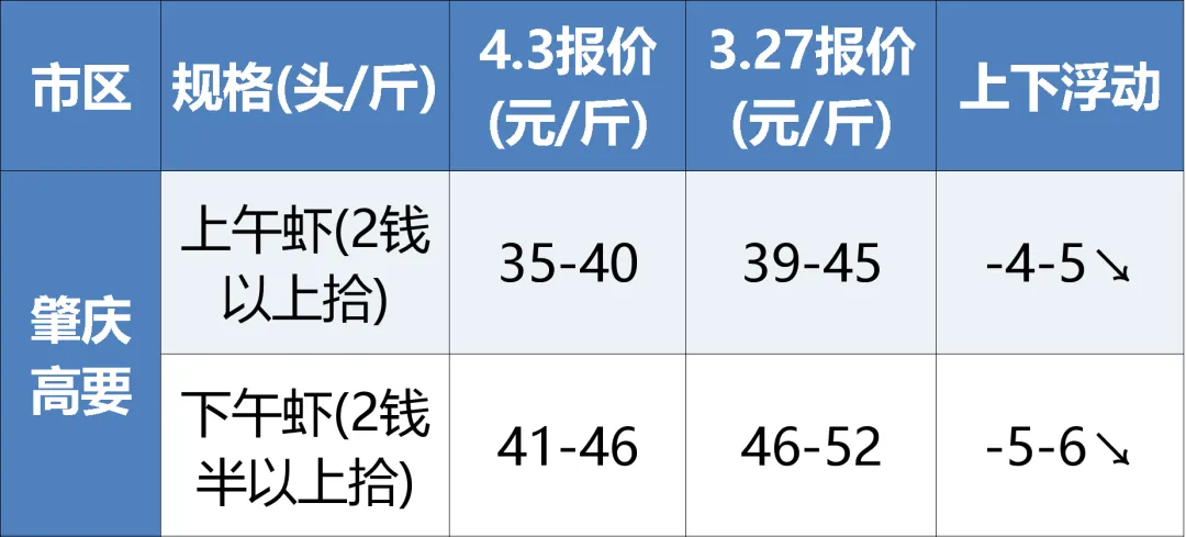 肇庆:目前高要上午虾(2钱以上拾)35-40元,下午虾(2钱半以上拾)41-46元,比上周再跌4-6元/斤,已连跌2周。