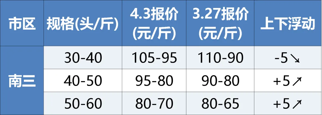 湛江:目前南三30-40头105-95元,40-50头95-80元,50-60头80-70元,本周虾价涨跌5元。