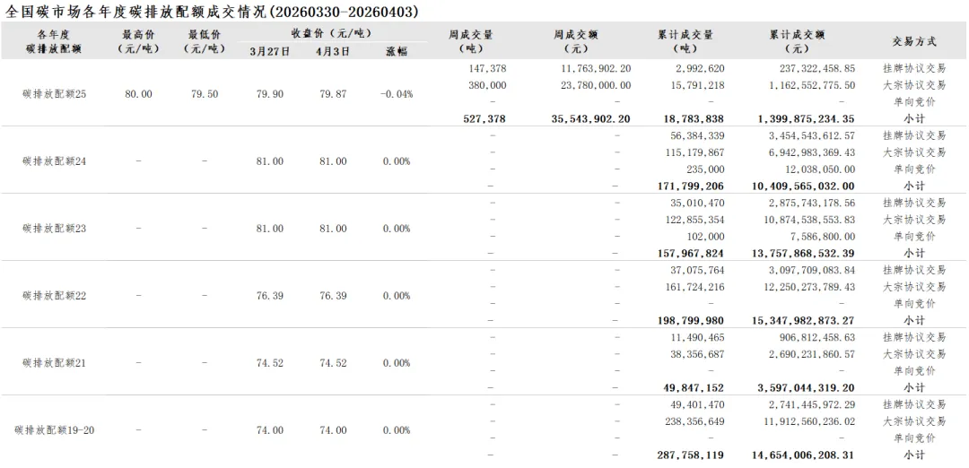 2026年1月1日至4月3日,全国碳市场碳排放配额成交量20,089,599吨,成交额1,503,723,967.95元。