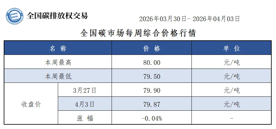 本周全国碳市场综合价格行情为:最高价80.00元/吨,最低价79.50元/吨,收盘价较上周五下跌0.04%。
