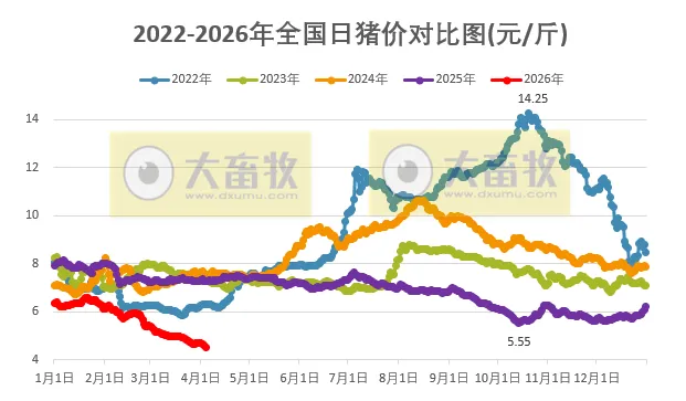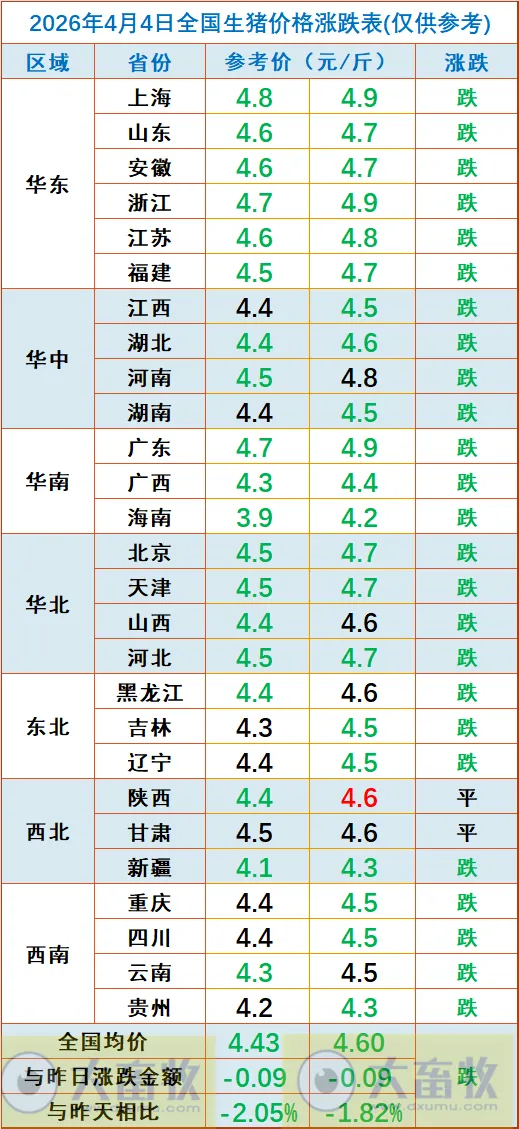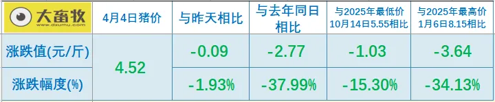 大畜牧小编根据我国27省的猪价数据,计算出2026年4月4日全国平均猪价为每斤4.52元,比昨天下跌0.09元,跌幅为1.93%,跌幅扩大,且连续4天持续下跌,累计下跌0.2元,持续创新低;