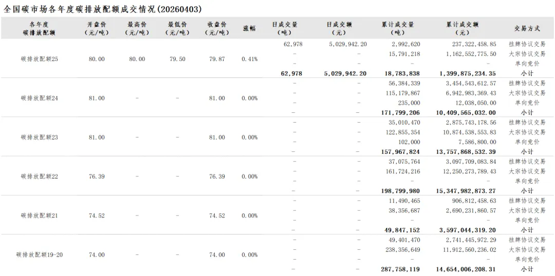 当前位置:首页>行情>【碳市行情】2026年4月3日全国碳市场成交数据