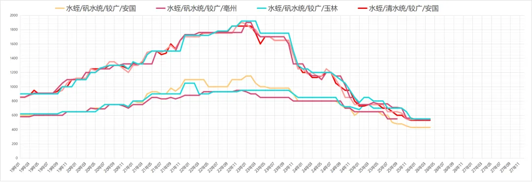 水蛭行情疲软,目前多为养殖户收购用作养殖用,产地鲜货收购价在38-45元/单斤,干品加工上市仍需一段时日,近阶段市场行情疲软运行,清水货售价510-530元;选装货560-570元。