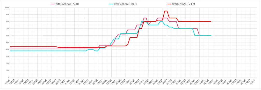蜂房价格下滑,近阶段市场货源走动迟缓,生虫的药厂货300元左右,好统货450元;带蜂仁货480-490元;小眼统货630-640元;选装货830-840元;全检货价格在1100-1160元之间。