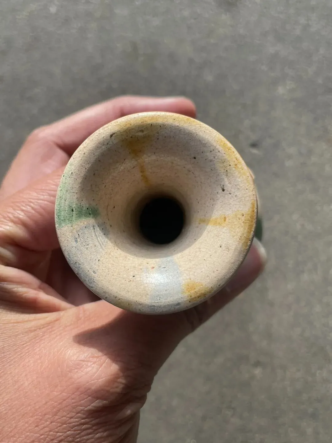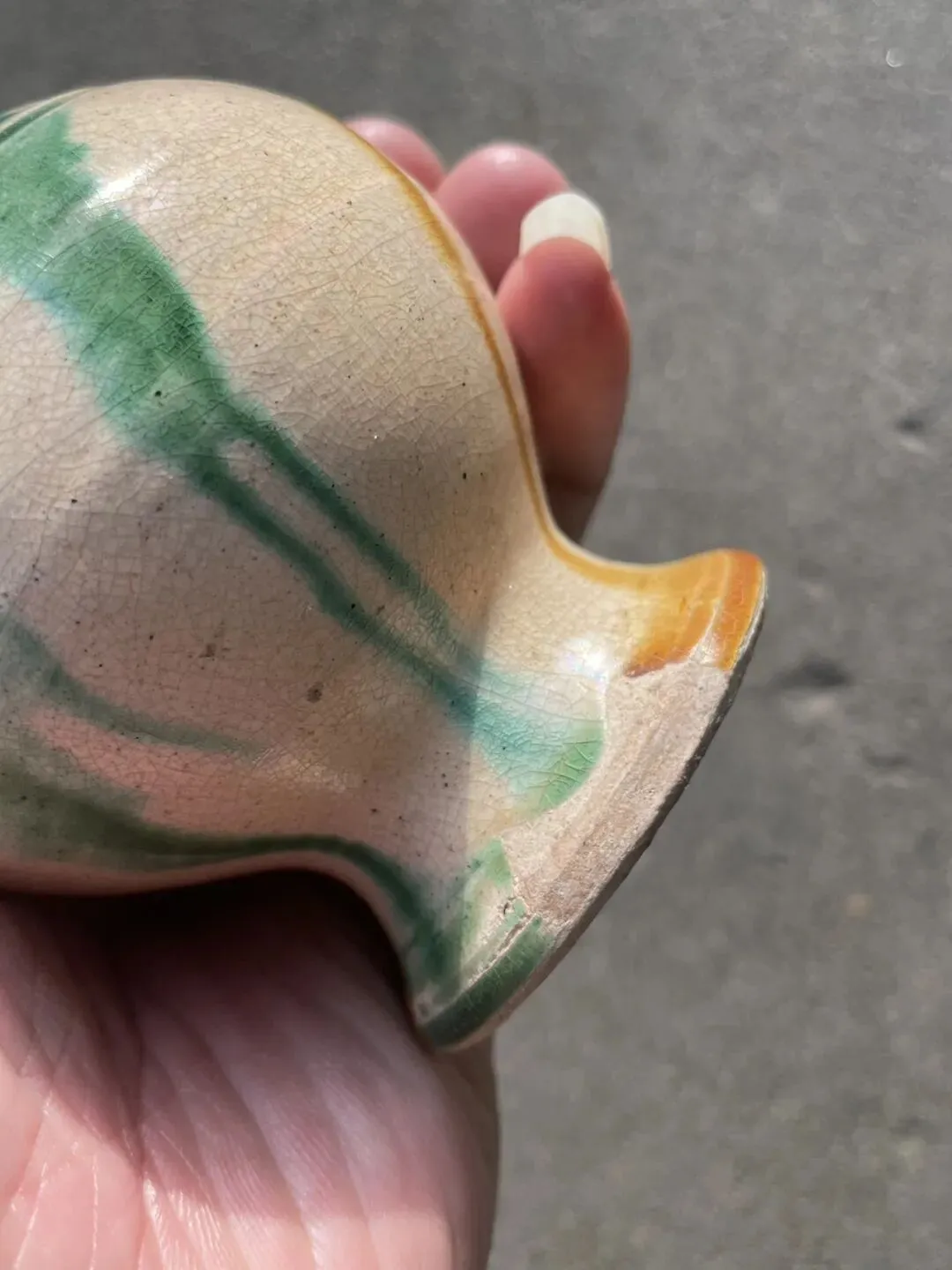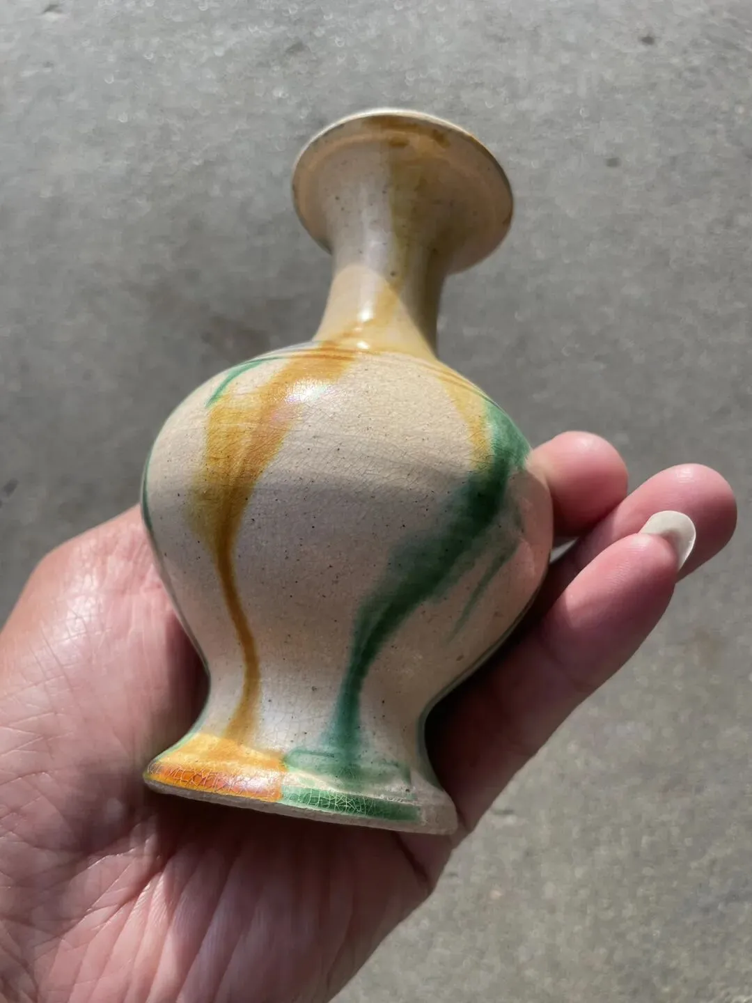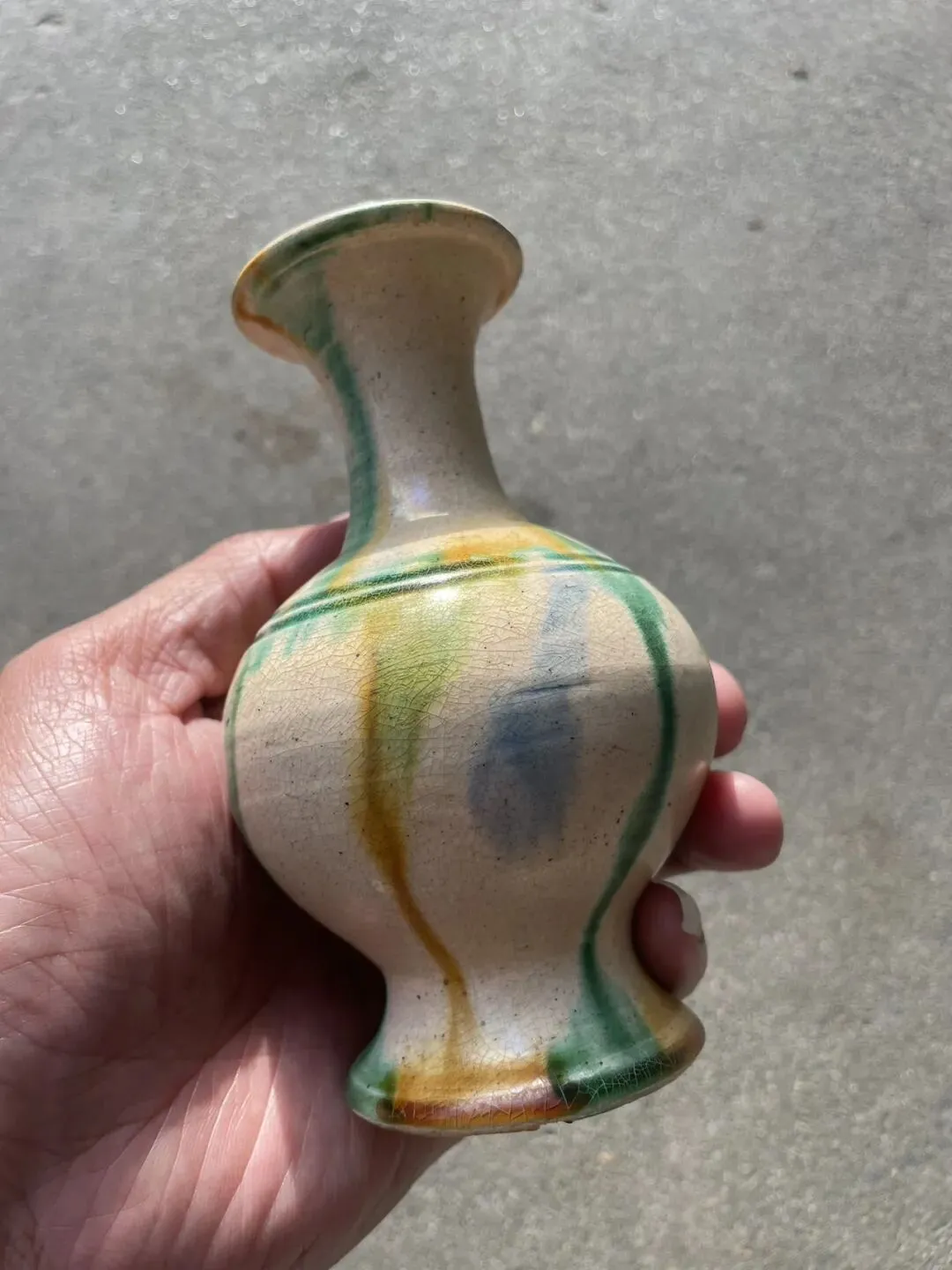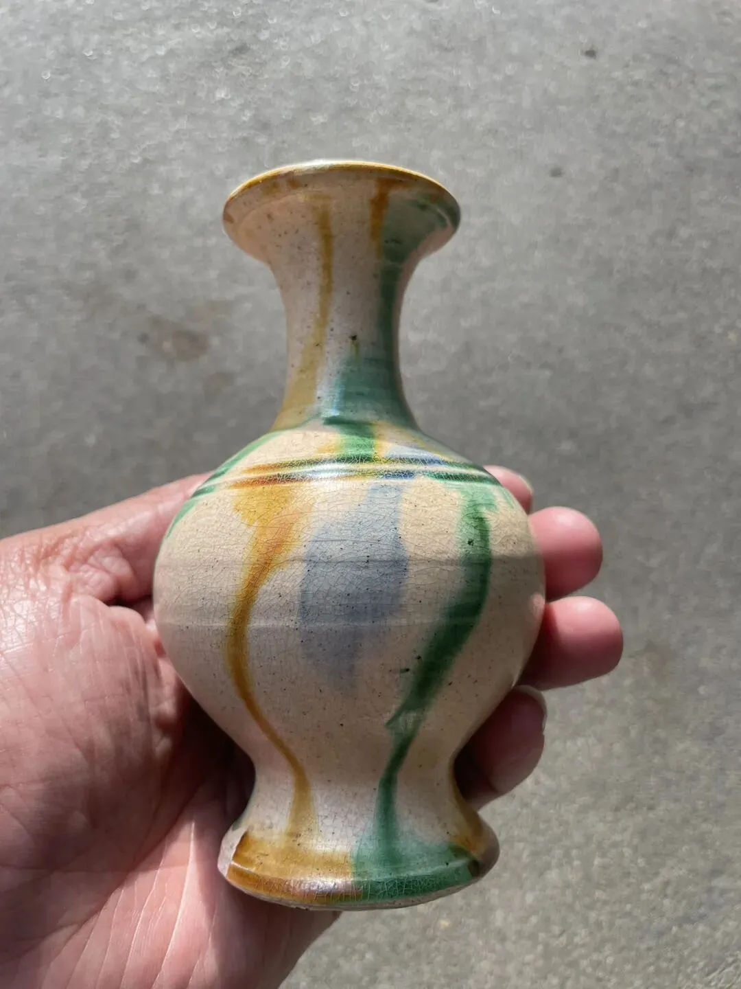 唐代三彩敞口赏瓶 造型很经典 敞口细颈 圆腹圈足外撇 开片自然舒服 属于低温釉 整体线条流畅 高12.8厘米