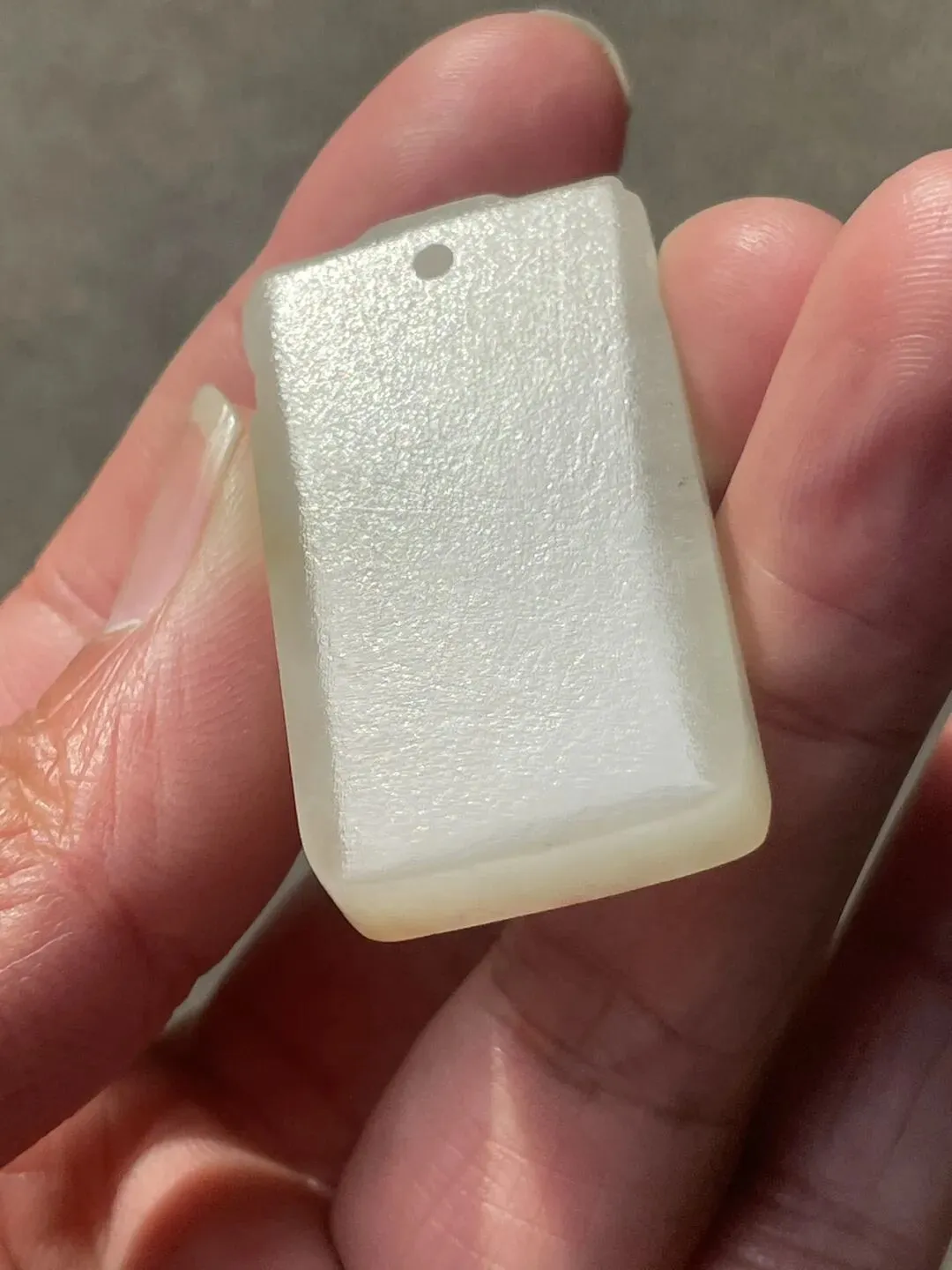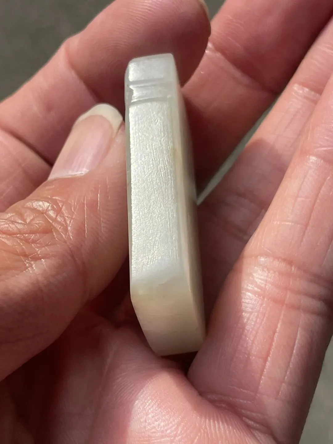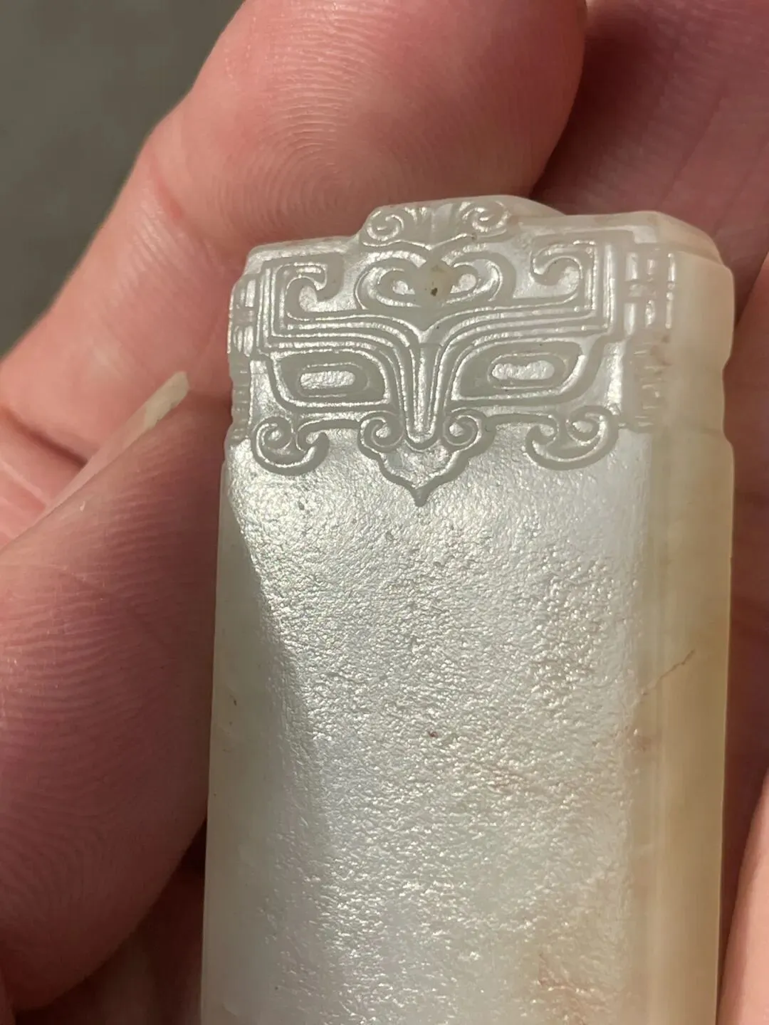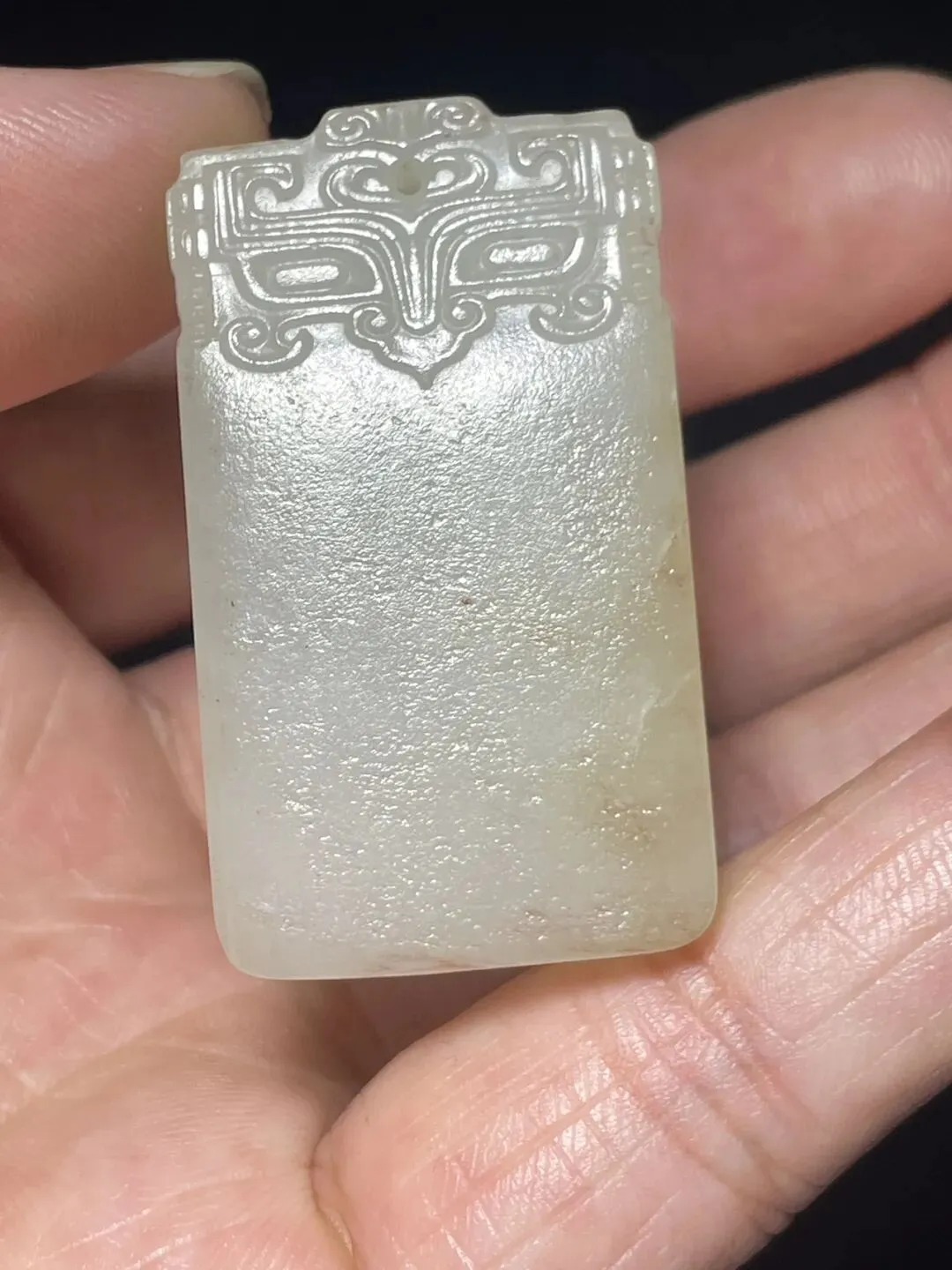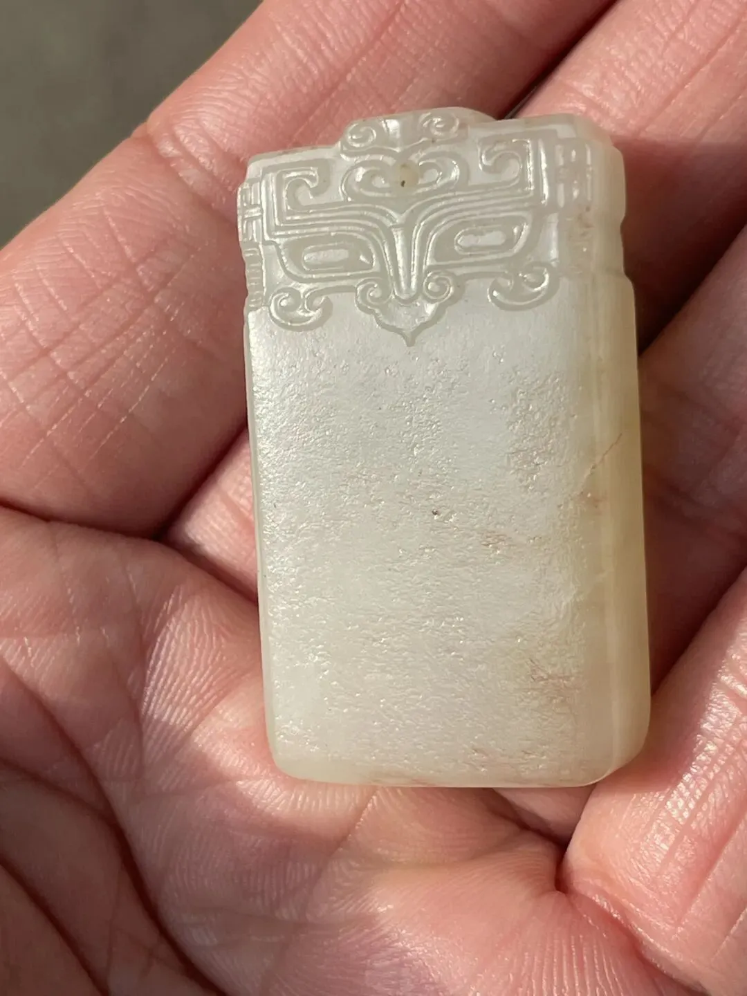 清代和田白玉兽面无事牌 玉质细腻油润 玉的毛孔纹理清晰可见 有少些黄沁 兽面纹饰有守护辟邪的吉祥内涵 下半部素面 寓意 :平平安安 无事烦扰 长4.3厘米 宽2厘米 厚0.9厘米