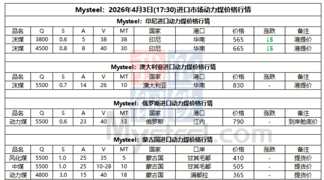3日进口市场动力煤价格暂稳运行。国际市场上,目前可流通现货资源持续偏紧,矿方及国际贸易商报价持续坚挺,现印尼Q3800巴拿马船FOB实际成交依旧围绕61美元/吨浮动;澳洲方面,因近期印度市场持续向好,高卡煤询盘火热,贸易商报价随之上调,据悉澳煤Q5500大船FOB报价在89-90美元/吨窄幅震荡。国内市场上,当前淡季特征明显,虽南方部分地区受降雨影响新能源出力减弱,但全国电厂存煤可用天数仍在安全水平线上,但考虑到进口煤受政策影响的不确定性,华南区域电厂批量释放低卡进口煤采购需求,其中Q3800采购价在537-540元/吨,采购量较上期大幅增长。预计短期内进口煤价将维持高位震荡态势,后续重点关注印尼货源释放情况及内贸煤价变动情况。价格方面,现印尼Q3800报565元/吨,Q4500报665元/吨,澳煤Q5500报830元/吨,均为港提价;现俄煤Q5500报790元/吨,为到岸舱底价。