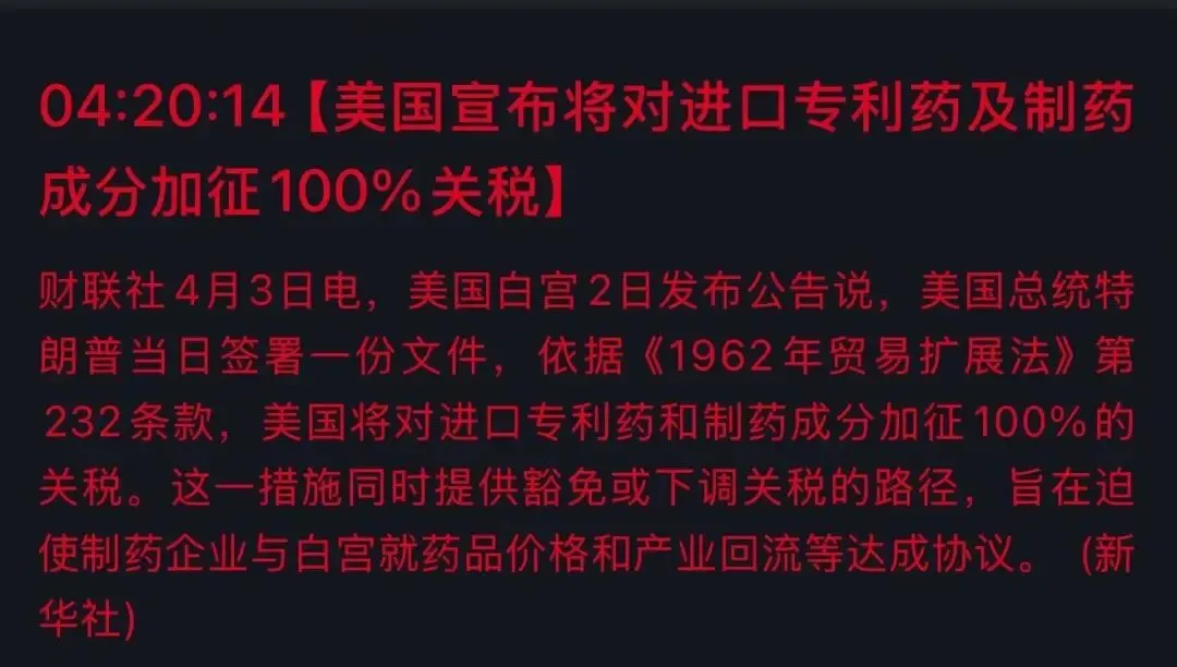 但是有专家表示,我们出口的大头是仿制药和原料药,这些没有被包含在加关税的范围内,所以这个政策对我们影响是有限的。因此今天市场的大跌不要怪罪到老美身上,就是自己人在砸。