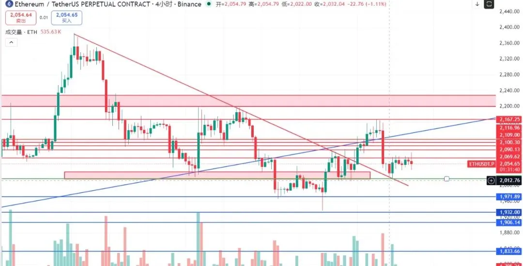 目前以太坊2050附近,最日提到的2020~2000附近趋势线支撑,后续也得到验证,目前从盘面看上方(2090~2108)附近压制,以及2118~2167附近压制,这几个位置值得再去博弈一次空单,止损控制在2230上方,短线朋友止损可以控制在2156上方,意外扫损,待下一进场位继续进一次即可,目标关注(2020~1980)~1960~1908~1838~1770~1580附近