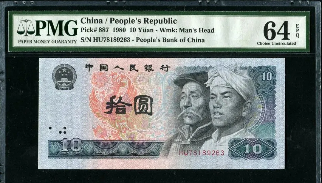 图里的这张纸币,大家一眼看过去,左边头像、右边花纹,印刷清楚,边上的“拾圆”字重得立住,表面光滑平展,拿在手里不带折痕,有细细的彩线和暗记,材质是那种有点韧劲的棉纸棉,边框的复杂花纹越瞧越有门道,这个PMG 64EPQ评级的编号直接印在防护壳上,是藏友们愿意信的那一张,64分EPQ算是极佳品相了,纸币本身就是“未流通”的状态。