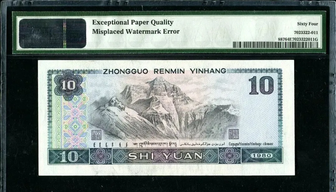 这张1980年10元最让藏友盯紧的点,是它没水印,正常行情下,左侧空白那块会有农民头像的钢印水印,举起来对着灯一照,清楚可见,可偏偏这枚错币,水印全无,干干净净就像漏了道工序,这可不是后天人为搞的,现在手里能见到的无水印十元,少之又少,这样的错版币种,市场上本身就稀罕得很。
