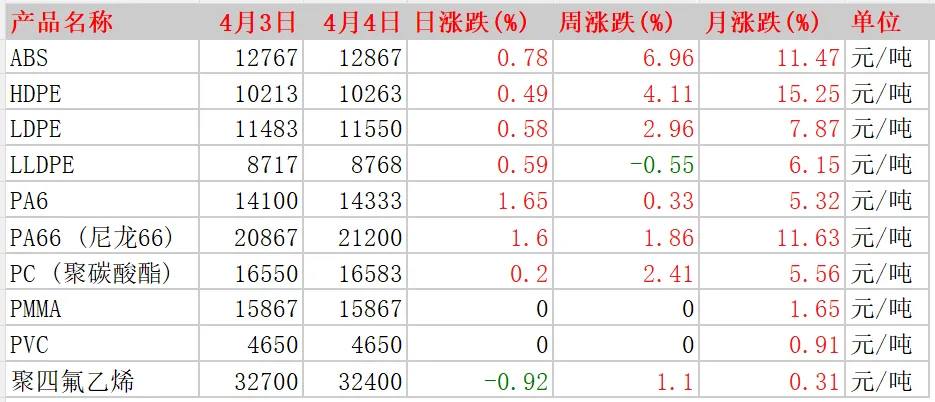 产品名称 | 4月3日 | 4月4日 | 日涨跌(%) | 周涨跌(%) | 月涨跌(%) | 单位 |