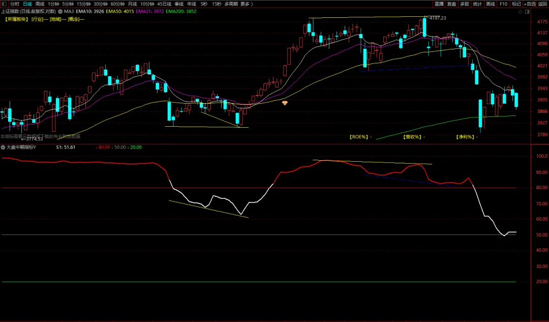 5.利用大盘指数和中期指标形成的顶背离或底背离来判断顶底。