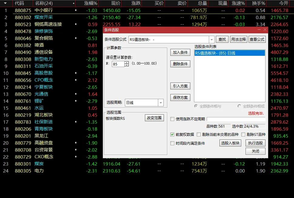 本周末RS强度85以上板块共24个,RS大于85的板块如下图所示: