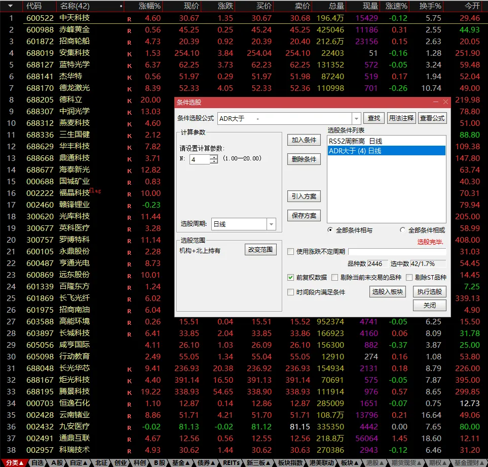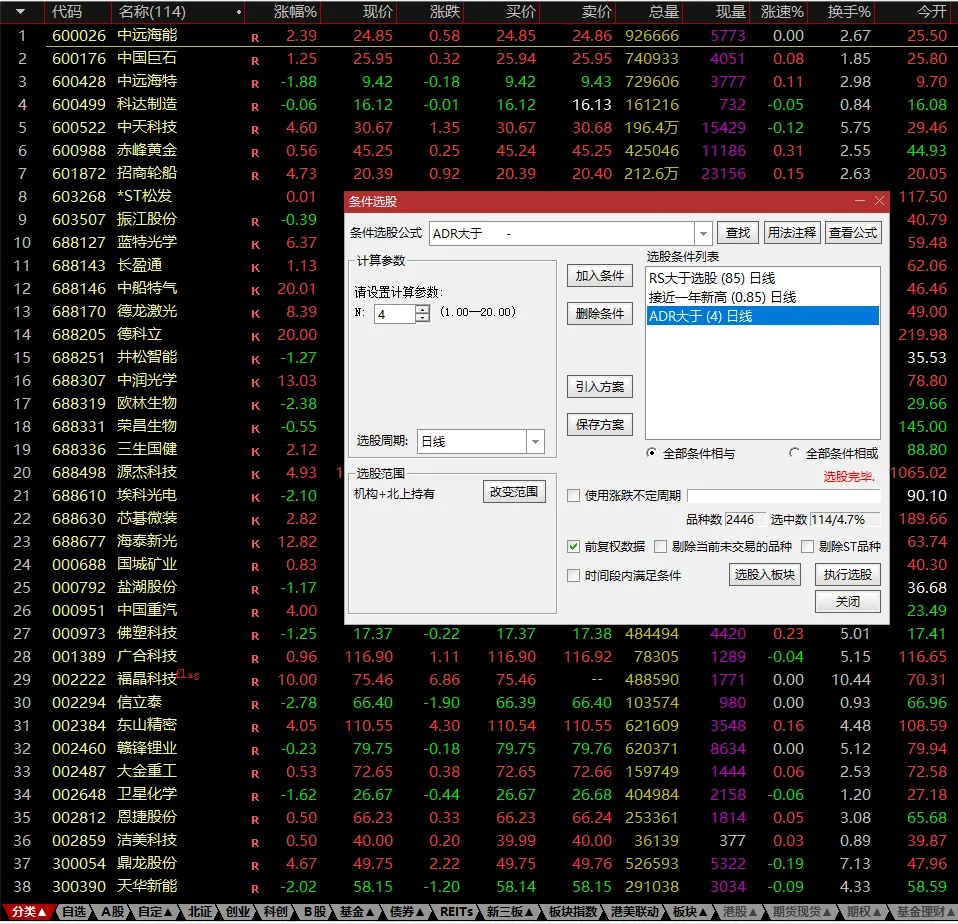 用“RS大于85选股+接近一年新高+ADR大于4”选股组合(基于机构和北上持股)选出部分个股案例如下: