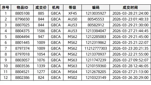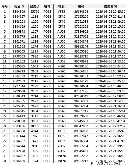 2026年3月22-29日,钱币天堂上拍的孙中山像开国纪念币截拍成交价统计如下(PCGS和GBCA);转自钱币天堂网站,仅供参考。