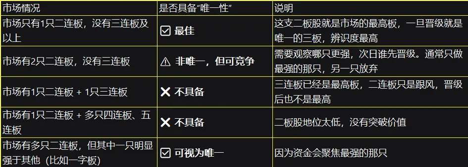 理想的情况下,整个市场只有一只二连板,没有三连板及以上的股票。如果整个市场有2-3只二连板,没有三连板及以上的股票,可观察只中一只强的看次日表现,整体见下表:*这个唯一性,并不只是表现在只有一只这样的股票,而是它的高身位体现出唯一性,比如重大利好等,即便有3只这样的股,也能从中看出它优于其他股所体现出来的高身位。