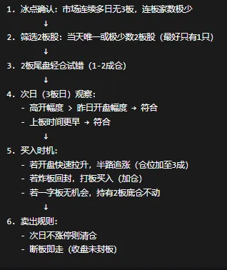 买点:通常在2板时轻仓试错,或者在3板确认封死时打板买入(而不是开盘追高)。卖点:如果3板封不住(炸板),当天就要出,不能等到次日。如果当天封住了,次日不能继续强势涨停(比如低开、高开低走),无条件止盈或止损。仓位:冰点试错,仓位通常很轻(比如1-2成仓)。因为知道大概率会错,所以用小仓位博取大收益。五、 总结