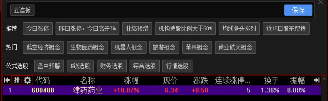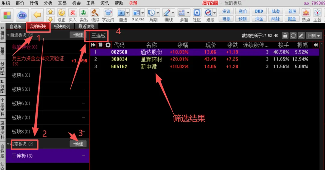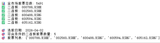 【自选股】——【动态模块】——输入【三连板】,见下图:在2026-04-02选出三连板有三只股票,不能做二进三,因为有三板存在,更谈不上唯一性。*同花顺选出的三连板更严格,它不我括四连板以上的股票,即便做三进四,还要看是否存在四连板或以上股票。如下虽然找不到四连板,但却找到了五连板2、聚宽平台