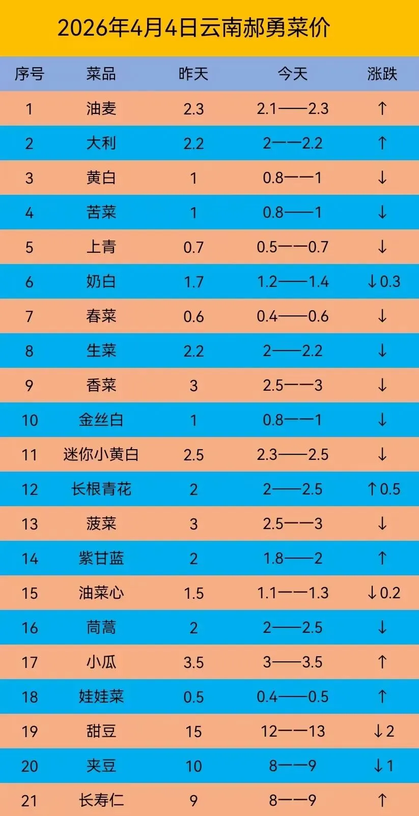 销区卖不起价格,产区价格高,发货到销区基本赚不到钱。不少冷库之前已经囤了少菜在地里,怕掉价,也不敢继续囤。前几天菜价上涨,主要是因为广东福建和江浙沪一带下雨,本地菜上货量少,加上清明节备货。昨天今天,产区抢货的人已经不多。这一水的菜品种比较分散,娃娃菜,西兰花和香菜占了比较大一部分,叶菜四大金刚并不多。现在北方菜陆续开始上市,如果销区天气转晴,本地菜上市量增大,对云南叶菜冲击大。个人认为,后续行情很难继续上涨,估计是平稳为主,有1-2毛的小幅下跌。