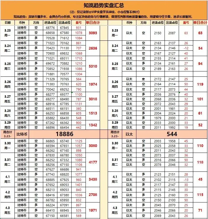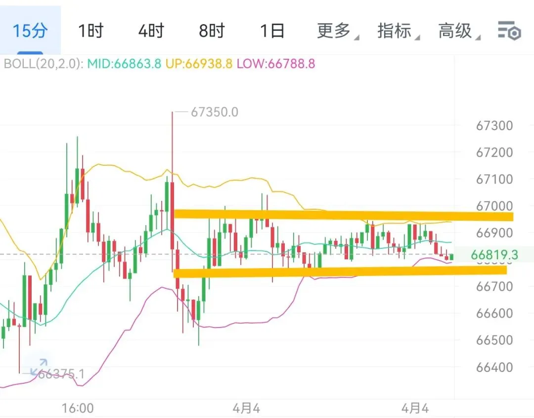 周末的盘面如同一池静水,但水面之下,多空双方早已布好阵仗。回顾从凌晨至今,盘面整体没有走出突破性新趋势,全程维持在窄幅箱体区间内来回震荡,属于典型的震荡磨盘行情。大饼围绕66500-67200核心区间反复拉锯,多空双方均未形成有效破位,整体这种箱体震荡行情,没有明确的多空单边趋势,操作上切忌贪心扛单,短线快进快出、有莉润就落袋才是最优解。