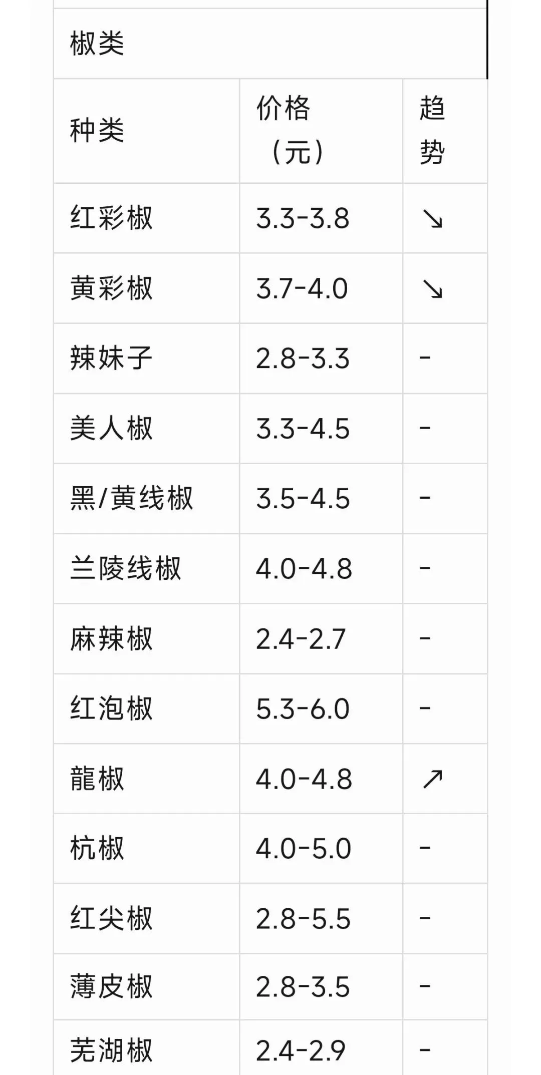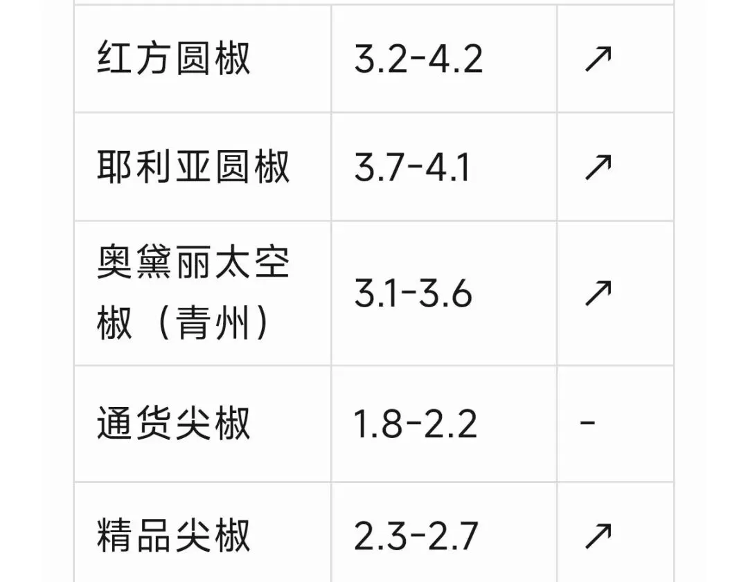 尖椒行情今日价格1.8-2.7元。青州太空椒今日行情3.1-3.6元左右。今日龙椒参考4.0-4.8元,一般质量与精品价格差距较大,质量差距大。本地红彩椒3.3-3.8元,黄彩椒价3.7-4.0元,五彩椒行情暴跌!西红柿毛粉/硬粉参考价1.6-2.2元左右。