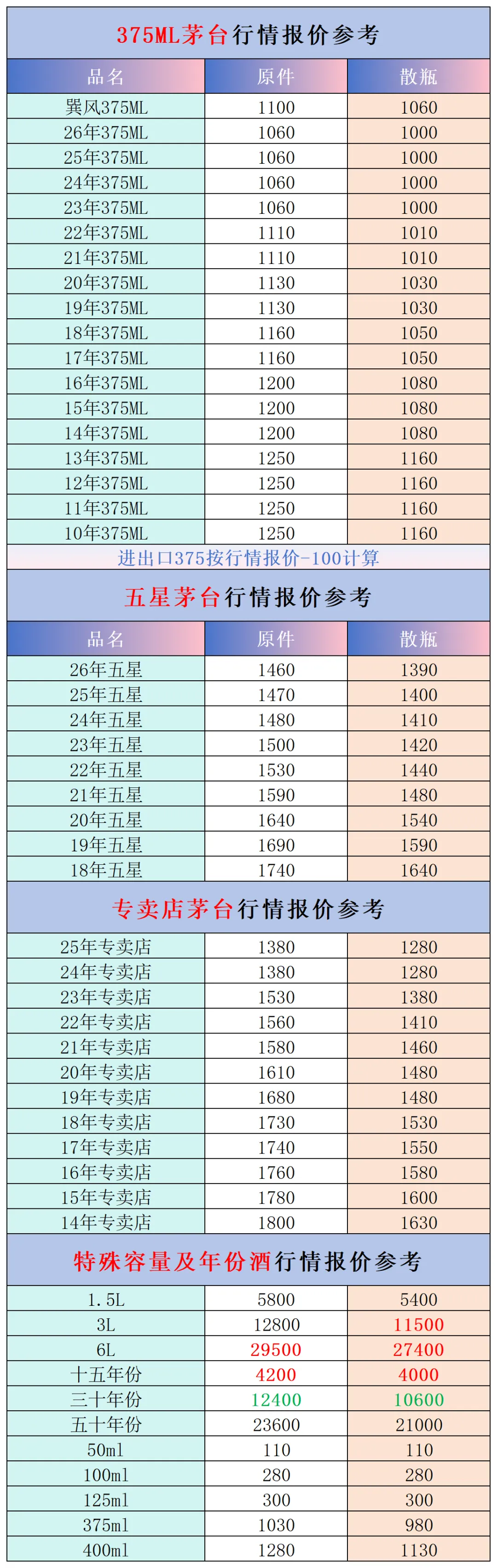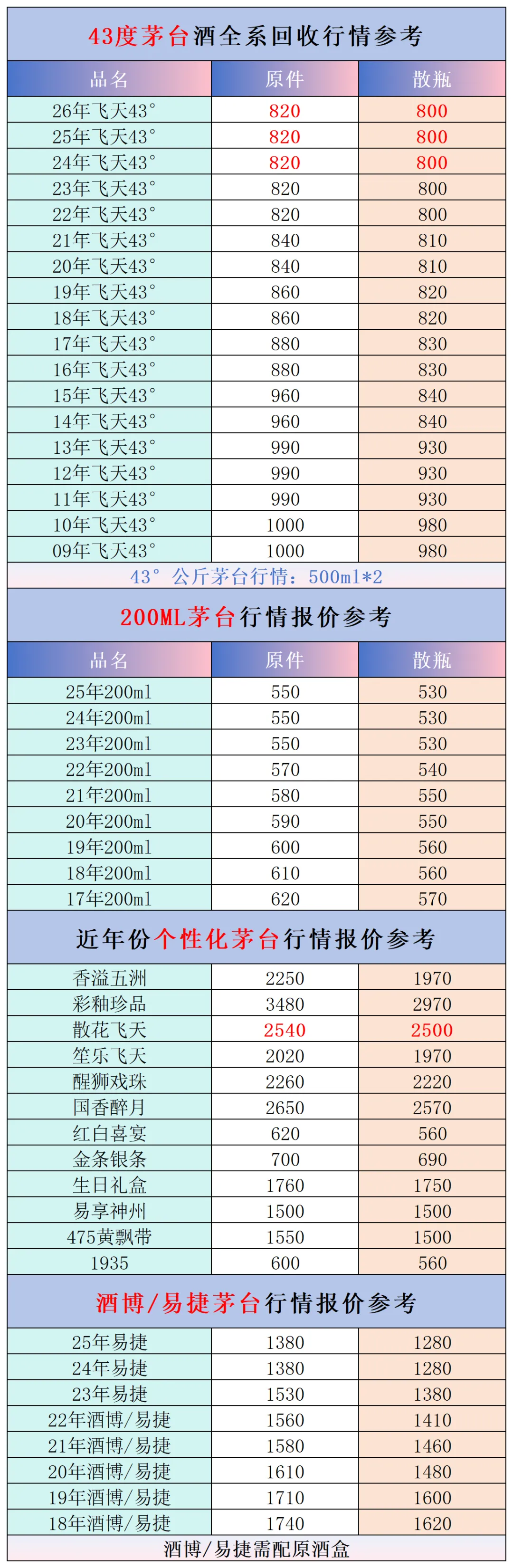 本公众号提供各种名酒回收行情报价,常规茅台、五粮液、洋河、剑南春、国缘等。所有报价根据市场买卖行情总结而来,每天更新最新报价!部分酒水每天涨跌幅较大,无法及时更新请谅解。本报价仅供参考,并非实际成交价格。感谢您的关注!我们会竭尽所能,提供更多更好的服务。