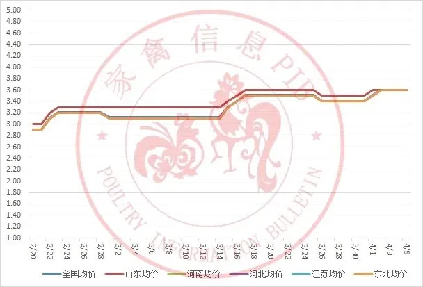2026年2月20日-2026年4月5日主流地区白羽鸡鸡苗均价走势图
