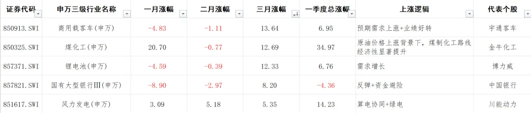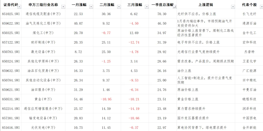 以申万三级行业划分为依据,一季度涨幅居前的板块有:通信线缆及配套、油气及炼化工程、煤化工、玻纤制造等。可以看出: