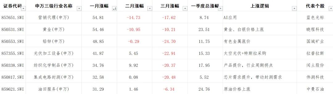 (3)1月热门板块,3月回撤较大,走出过山车行情,一季度累积涨幅并不大。如营销代理、黄金、铅锌、光伏加工设备等板块。