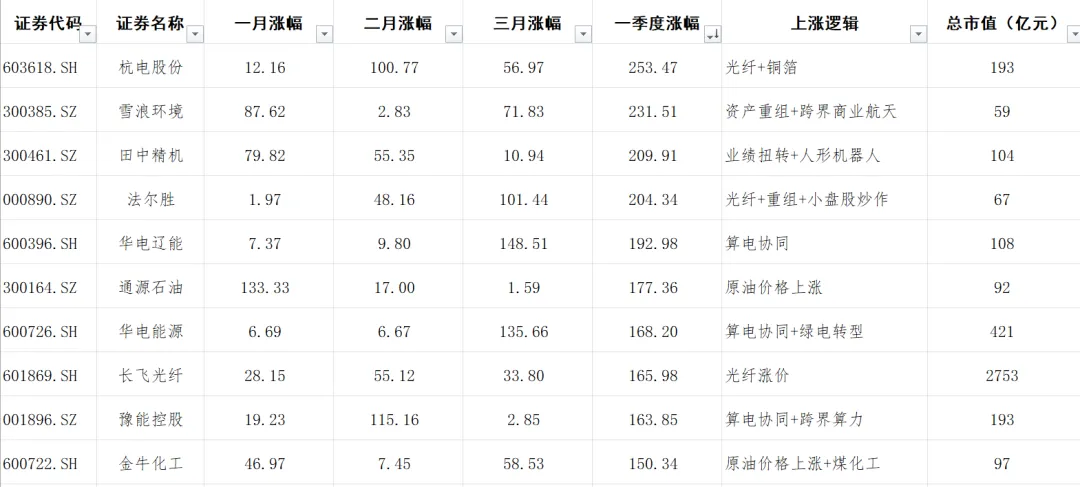 剔除2026年一季度新上市公司,A股沪、深、京三市共有上市公司5466家。其中,一季度上涨的有2236家,约占41%,35家涨幅超100%;一季度持平的约14家;一季度下跌的约3216家,其中7家跌幅超50%。涨幅前十的为:杭电股份、雪浪环境、田中精机、法尔胜等。涨幅前十公司,除长飞光纤外,均为中小市值,且涨幅明显高于板块指数,具有明显的小盘股炒作特征。