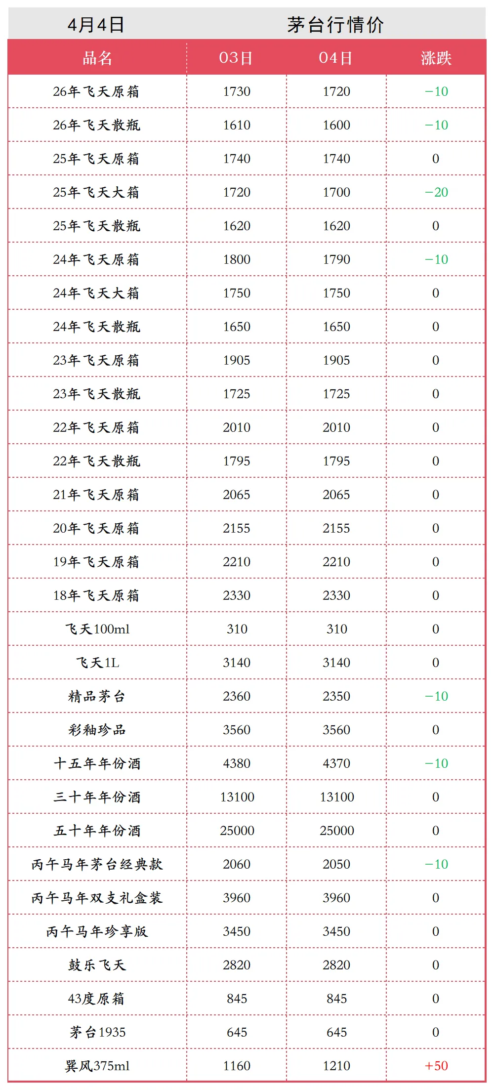 行情转冷!4 月 4 日飞天茅台多规格集体下跌